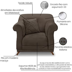 Modelo: Poltrona Decorativa Retrô Polo Com Almofada Veludo Pés: Madeira Maciça Assento: Fixo com espuma D23 e plumante em silicone Encosto: Fico com percintas elásticas italiana, espuma HR28 e plumante em silicone Sistema de Montagem: Necessário fixar os pés