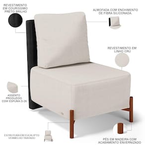 Revestimento do encosto em Couríssimo na cor Preto e do assento em Linho na cor Cru, de alta qualidade.