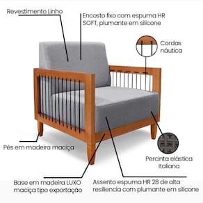 Base e pés: Madeira Maciça Eucalipto Espuma: HR 28 - poliuretano de alta resiliência Tecido: Linho