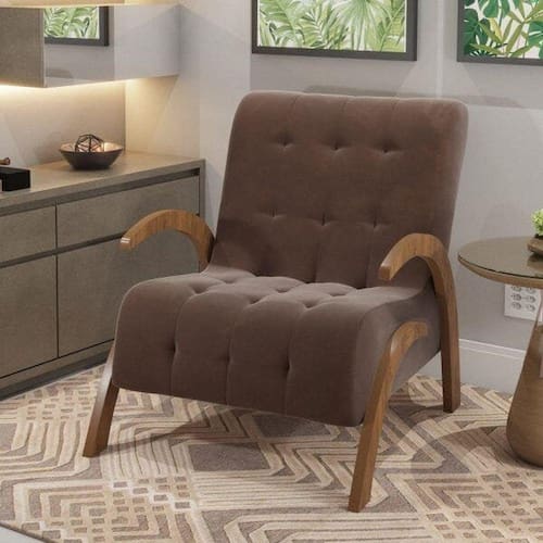 A Poltrona Garden é uma ótima opção para completar a sala de estar, sala de espera ou quarto. Sua estrutura mista em MDP 25mm e madeira de eucalipto de reflorestamento garante mais resistência e durabilidade. O conforto fica por conta do revestimento em espuma no assento e encosto combinado com o uso de percintas no acento, além do acabamento externo em tecido. Além disso, conta com um design diferenciado, trazendo sofisticação e requinte ao ambiente. Acompanha Almofadas extras: Não Acompanha Puff: Não Almofada do assento: Fixa Almofada do encosto: Fixa Altura do assento até o chão: 23 cm Altura do Encosto: 57 cm Ambiente Principal: Sala de Estar Complexidade da Montagem: Baixa: pode ser montado por uma pessoa sozinha Cor: Pinho/Marrom Cor do Produto: Pinho/Marrom Design Assinado: Não Enchimento do Assento: Espuma D-20 Enchimento do Braço: Não Possui Enchimento do Encosto: Espuma D-20 Encosto para a Cabeça: Não Estampado: Não Extensível: Não Firmeza do Assento: Firme Itens Inclusos: 1 Poltrona, Kit Ferragens e Manual de Montagem Linha ou Coleção: Viero Manual de Montagem e Instalação: https://product-hub-prd.madeiramadeira.com.br/manual/documents/manual_poltrona.pdf Material do Braço: MDF/MDP Material dos Pés: MDF Modelo de Poltrona: Fixo Necessita Montagem: Sim Origem do Produto: Nacional Peso: 17 kg Possui Percintas Elásticas: Sim Possui Pés: 04 Possui Rodízio: Não Recomendações de Uso, Manutenção e Limpeza: Limpar com pano umedecido com água Sistema de Montagem: Parafusos Suporta Até (kg): 100 kg Tecido Predominante: Veludo Tipo de Assento: Fixo Tipo de Encosto: Fixo Tipo de Espuma do Assento: Espuma Convencional Tipo de Espuma do Encosto: Espuma Convencional Tipo de Poltrona: Do Papai Ean: 7908439662482