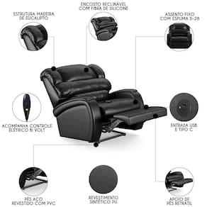 Altura: 95 cm | AssemblyRequired: Sim, sugerimos a contratação do nosso serviço de montagem (para os CEPs em que o serviço está dispon | Color: Preto | ColorFamily: Preto | ColorSimple: Preto | ColorSupplier: Preto | Cor: Preto | Gênero: Unisex | Largura: 93 cm | Manual: Sim | Marca: Mpozenato | Material: Madeira de Eucalipto | MaterialFamily: Madeira de Eucalipto | Model: Kalie | Origem: | OriginCountry: | OriginState: PR | Peso: 45 kg | Peso Suportado: 130 Kg | ProductContents: 1 Poltrona | ProductHeight: 95 | ProductInstructions: Produto para uso em ambiente interno, nao devendo ficar exposto ao sol, calor e umidade excessivos. | ProductLength: 96 | ProductWarranty: 90 dias após o do produto | ProductWeight: 45 Kg | ProductWidth: 93 | Profundidade: 96 cm | Requere montagem: Sim | SizeDescription: 95 x 93 x 96 cm | SupplierSimpleName: Poltrona do Papai Reclinável Kalie Controle Power Elétrico USB FH9 PU Preto Brilho - Mpozenato | Tipo de : Fabricante