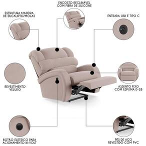Com um design que alia modernidade e elegância, a Poltrona Reclinável é a escolha perfeita para aqueles que não abrem mão do conforto supremo. Seja mergulhando nas páginas de um bom livro ou se deliciando com seus filmes e séries prediletos, esta Poltrona Do Papai promete ser o seu refúgio particular. A facilidade de ajuste com o botão elétrico permite que você encontre a posição perfeita com o toque de um botão. Ah! E ela ainda conta com entrada USB e tipo C ideal para carregar seus eletrônicos enquanto descansa, tudo pensado para proporcionar uma experiência imersiva sem igual. E não é só sobre conforto, mas também sobre durabilidade e estilo, como a madeira maciça de eucalipto e o revestimento de alta qualidade. As dimensões generosas garantem que você tenha espaço de sobra para relaxar, enquanto a capacidade de suportar até 110kg assegura que é uma peça robusta e . Não é apenas uma poltrona, é um upgrade na sua qualidade de vida, trazendo o glamour do cinema diretamente para o seu lar.