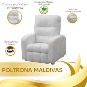 Poltrona Do Papai Reclinável Maldivas Corano Branco Speciale Home Branco Como e bom ter um lugar para descansar depois de um longo dia no trabalho, e melhor ainda se este lugar for confortavel e relaxante. A poltrona Maldivas reclinavel e a melhor opcao para conseguir seus momentos de descanso e tonar seu momento de lazer ainda mais agradavel, e um movel sofisticado e vai valorizar a decoracao do seu ambiente. Perfeito para aquele momento de leitura ou assistir um filme na televisao, alem disso possui design moderno, onde a parte reclinavel remete a formas geometricas. Confira os detalhes desta poltrona maravilhosa que vai te encantar!