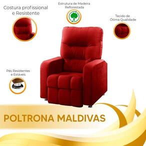 Poltrona Do Papai Reclinável Maldivas Suede Vermelho Speciale Home Vermelho Como e bom ter um lugar para descansar depois de um longo dia no trabalho, e melhor ainda se este lugar for confortavel e relaxante. A poltrona Maldivas reclinavel e a melhor opcao para conseguir seus momentos de descanso e tonar seu momento de lazer ainda mais agradavel, e um movel sofisticado e vai valorizar a decoracao do seu ambiente. Perfeito para aquele momento de leitura ou assistir um filme na televisao, alem disso possui design moderno, onde a parte reclinavel remete a formas geometricas. Confira os detalhes desta poltrona maravilhosa que vai te encantar! Caracteristicas do Produto: Material da Estrutura: Madeira de reflorestamento. Espuma: D 20 Peso Suportado: Ate 120 Quilos Possui Pes: Sim 4 Material dos Pes: Aluminio Poltrona e reclinavel Material do Assento: Espuma D 20 com percintas elasticas. Material do Encosto: 100 porcento Fibra Siliconada Tipo de Tecido: Suede