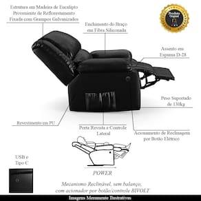 Diferenciais: Apoio de pés retrátil, Acompanha controle para acionamento e bolso lateral para revistas e livros