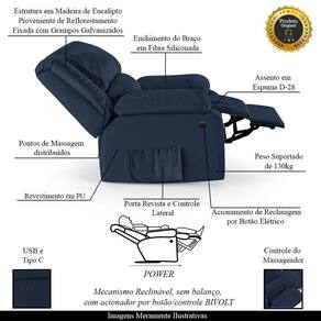 Diferenciais: Apoio de pés retrátil, Com botão touch para acionamento, controle para massagem e bolso lateral para revistas e livros