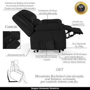 Diferenciais: Apoio de pés retrátil, acompanha controle para acionamento, elevação Lift, e bolso lateral para revistas e livros