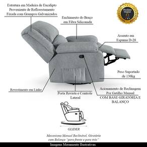 Diferenciais: Apoio de pés retrátil, poltrona giratória e balanço, acompanha controle para ativar massagem, gatilho lateral para acionar regulagem e bolso lateral para revistas e livros