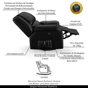 Diferenciais: Apoio de pés retrátil, poltrona giratória e balanço, acompanha controle para ativar massagem, gatilho lateral para acionar regulagem e bolso lateral para revistas e livros
