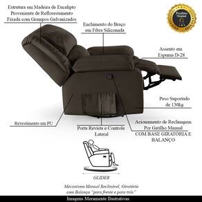 Que tal criar seu próprio home cinema? Aqui, vamos mostrar como você pode montar o seu! Com o local adequado, alguns itens decorativos e uma poltrona ideal, você garantirá um espaço confortável e imersivo. O primeiro passo é investir em equipamentos de alta qualidade! Olha só que lindeza a nossa Poltrona do Papai Reclinável Melim. Ela foi projetada para proporcionar máximo conforto e funcionalidade, esta poltrona é a escolha ideal para quem busca relaxamento, estilo e uma experiência de cinema privada. A poltrona contém sistema glider, acionamento reclinável elétrico por botão em uma das braças, encosto reclinável, apoio para os pés manual além disso ela é giratória com balanço suave perfeito para oferecer um relaxamento total. Este ajuste é feito manualmente, utilizando um gatilho localizado em uma das braças na lateral da poltrona. Ao puxar ou pressionar esse gatilho, o usuário pode reclinar o encosto ou levantar o apoio para os pés, ajustando a poltrona à posição desejada. Com capacidade para suportar até 130 kg, oferecendo segurança e estabilidade ao consumidor. O revestimento em PU Marrom oferece um toque de sofisticação e conforto, enquanto a estrutura em Madeira de Lei Eucalipto com Controle de Umidade, Proveniente de Reflorestamento, Fixa com Grampos Galvanizados garante resistência e durabilidade. O Assento/Encosto foi preenchido em Espuma D-28 e o braço foi preenchido com fibra siliconada, respectivamente, para um conforto adicional. O assento (fixo) e o apoio de Pés Retrátil proporcionam um apoio perfeito para suas pernas, aumentando o conforto. O encosto reclinável, possibilita ajustá- lo para a posição ideal de relaxamento. Já os pés giratório foram feitos em aço revestido com plástico, adicionando um toque de elegância ao produto. E tem mais!! Ela contém Bolso lateral para revistas e controle nas braças perfeito para armazenar livros e outros objetos, mantendo tudo ao seu alcance. Com um design moderno e prático, esta poltrona se tornará o destaque da sua sala de estar. Afinal, sua casa merece a Poltrona do Papai Reclinável Melim Glider Giratória. Adquira a sua agora mesmo e transforme sua sala de estar em um verdadeiro cinema!