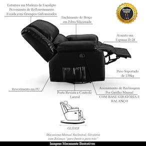 Que tal criar seu próprio home cinema? Aqui, vamos mostrar como você pode montar o seu! Com o local adequado, alguns itens decorativos e uma poltrona ideal, você garantirá um espaço confortável e imersivo. O primeiro passo é investir em equipamentos de alta qualidade! Olha só que lindeza a nossa Poltrona do Papai Reclinável Melim. Ela foi projetada para proporcionar máximo conforto e funcionalidade, esta poltrona é a escolha ideal para quem busca relaxamento, estilo e uma experiência de cinema privada. A poltrona contém sistema glider, acionamento reclinável elétrico por botão em uma das braças, encosto reclinável, apoio para os pés manual além disso ela é giratória com balanço suave perfeito para oferecer um relaxamento total. Este ajuste é feito manualmente, utilizando um gatilho localizado em uma das braças na lateral da poltrona. Ao puxar ou pressionar esse gatilho, o usuário pode reclinar o encosto ou levantar o apoio para os pés, ajustando a poltrona à posição desejada. Com capacidade para suportar até 130 kg, oferecendo segurança e estabilidade ao consumidor. O revestimento em PU Preto Brilhoso oferece um toque de sofisticação e conforto, enquanto a estrutura em Madeira de Lei Eucalipto com Controle de Umidade, Proveniente de Reflorestamento, Fixa com Grampos Galvanizados garante resistência e durabilidade. O Assento/Encosto foi preenchido em Espuma D-28 e o braço foi preenchido com fibra siliconada, respectivamente, para um conforto adicional. O assento (fixo) e o apoio de Pés Retrátil proporcionam um apoio perfeito para suas pernas, aumentando o conforto. O encosto reclinável, possibilita ajustá- lo para a posição ideal de relaxamento. Já os pés giratório foram feitos em aço revestido com plástico, adicionando um toque de elegância ao produto. E tem mais!! Ela contém Bolso lateral para revistas e controle nas braças perfeito para armazenar livros e outros objetos, mantendo tudo ao seu alcance. Com um design moderno e prático, esta poltrona se tornará o destaque da sua sala de estar. Afinal, sua casa merece a Poltrona do Papai Reclinável Melim Glider Giratória. Adquira a sua agora mesmo e transforme sua sala de estar em um verdadeiro cinema!