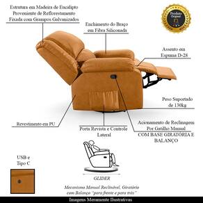 Que tal criar seu próprio home cinema? Aqui, vamos mostrar como você pode montar o seu! Com o local adequado, alguns itens decorativos e uma poltrona ideal, você garantirá um espaço confortável e imersivo. O primeiro passo é investir em equipamentos de alta qualidade! Olha só que lindeza a nossa Poltrona do Papai Reclinável Melim. Ela foi projetada para proporcionar máximo conforto e funcionalidade, esta poltrona é a escolha ideal para quem busca relaxamento, estilo e uma experiência de cinema privada. A poltrona contém sistema glider com USB Bivolt, acionamento reclinável elétrico por botão em uma das braças, encosto reclinável, apoio para os pés manual além disso ela é giratória com balanço suave perfeito para oferecer um relaxamento total. Este ajuste é feito manualmente, utilizando um gatilho localizado em uma das braças na lateral da poltrona. Ao puxar ou pressionar esse gatilho, o usuário pode reclinar o encosto ou levantar o apoio para os pés, ajustando a poltrona à posição desejada. Com capacidade para suportar até 130 kg, oferecendo segurança e estabilidade ao consumidor. O revestimento em PU Whisky oferece um toque de sofisticação e conforto, enquanto a estrutura em Madeira de Lei Eucalipto com Controle de Umidade, Proveniente de Reflorestamento, Fixa com Grampos Galvanizados garante resistência e durabilidade. O Assento/Encosto foi preenchido em Espuma D-28 e o braço foi preenchido com fibra siliconada, respectivamente, para um conforto adicional. O assento (fixo) e o apoio de Pés Retrátil proporcionam um apoio perfeito para suas pernas, aumentando o conforto. O encosto reclinável, possibilita ajustá- lo para a posição ideal de relaxamento. Já os pés giratório foram feitos em aço revestido com plástico, adicionando um toque de elegância ao produto. E tem mais!! Ela contém Bolso lateral para revistas e controle nas braças perfeito para armazenar livros e outros objetos, mantendo tudo ao seu alcance. Com um design moderno e prático, esta poltrona se tornará o destaque da sua sala de estar. Afinal, sua casa merece a Poltrona do Poltrona do Papai Reclinável Melim Glider Giratória USB. Adquira a sua agora mesmo e transforme sua sala de estar em um verdadeiro cinema!