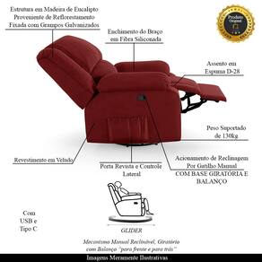 Poltrona do Papai Reclinável Melim Glider Giratória USB Veludo FH1 - D`Rossi - Vermelho