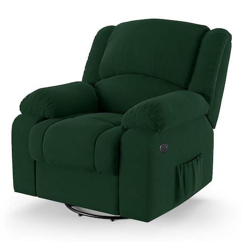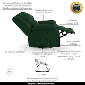 Que tal criar seu próprio home cinema? Aqui, vamos mostrar como você pode montar o seu! Com o local adequado, alguns itens decorativos e uma poltrona ideal, você garantirá um espaço confortável e imersivo. O primeiro passo é investir em equipamentos de alta qualidade! Olha só que lindeza a nossa Poltrona do Papai Reclinável Melim. Ela foi projetada para proporcionar máximo conforto e funcionalidade, esta poltrona é a escolha ideal para quem busca relaxamento, estilo e uma experiência de cinema privada. A poltrona contém sistema glider com USB Bivolt, acionamento reclinável elétrico por botão em uma das braças, encosto reclinável, apoio para os pés manual além disso ela é giratória com balanço suave perfeito para oferecer um relaxamento total. Este ajuste é feito manualmente, utilizando um gatilho localizado em uma das braças na lateral da poltrona. Ao puxar ou pressionar esse gatilho, o usuário pode reclinar o encosto ou levantar o apoio para os pés, ajustando a poltrona à posição desejada. Com capacidade para suportar até 130 kg, oferecendo segurança e estabilidade ao consumidor. O revestimento em Veludo Verde oferece um toque de sofisticação e conforto, enquanto a estrutura em Madeira de Lei Eucalipto com Controle de Umidade, Proveniente de Reflorestamento, Fixa com Grampos Galvanizados garante resistência e durabilidade. O Assento/Encosto foi preenchido em Espuma D-28 e o braço foi preenchido com fibra siliconada, respectivamente, para um conforto adicional. O assento (fixo) e o apoio de Pés Retrátil proporcionam um apoio perfeito para suas pernas, aumentando o conforto. O encosto reclinável, possibilita ajustá- lo para a posição ideal de relaxamento. Já os pés giratório foram feitos em aço revestido com plástico, adicionando um toque de elegância ao produto. E tem mais!! Ela contém Bolso lateral para revistas e controle nas braças perfeito para armazenar livros e outros objetos, mantendo tudo ao seu alcance. Com um design moderno e prático, esta poltrona se tornará o destaque da sua sala de estar. Afinal, sua casa merece a Poltrona do Poltrona do Papai Reclinável Melim Glider Giratória USB. Adquira a sua agora mesmo e transforme sua sala de estar em um verdadeiro cinema!