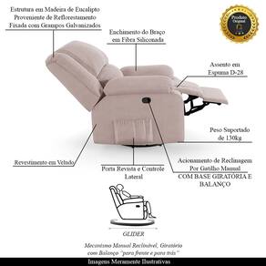 Que tal criar seu próprio home cinema? Aqui, vamos mostrar como você pode montar o seu! Com o local adequado, alguns itens decorativos e uma poltrona ideal, você garantirá um espaço confortável e imersivo. O primeiro passo é investir em equipamentos de alta qualidade! Olha só que lindeza a nossa Poltrona do Papai Reclinável Melim. Ela foi projetada para proporcionar máximo conforto e funcionalidade, esta poltrona é a escolha ideal para quem busca relaxamento, estilo e uma experiência de cinema privada. A poltrona contém sistema glider, acionamento reclinável elétrico por botão em uma das braças, encosto reclinável, apoio para os pés manual além disso ela é giratória com balanço suave perfeito para oferecer um relaxamento total. Este ajuste é feito manualmente, utilizando um gatilho localizado em uma das braças na lateral da poltrona. Ao puxar ou pressionar esse gatilho, o usuário pode reclinar o encosto ou levantar o apoio para os pés, ajustando a poltrona à posição desejada. Com capacidade para suportar até 130 kg, oferecendo segurança e estabilidade ao consumidor. O revestimento em Veludo Rosê oferece um toque de sofisticação e conforto, enquanto a estrutura em Madeira de Lei Eucalipto com Controle de Umidade, Proveniente de Reflorestamento, Fixa com Grampos Galvanizados garante resistência e durabilidade. O Assento/Encosto foi preenchido em Espuma D-28 e o braço foi preenchido com fibra siliconada, respectivamente, para um conforto adicional. O assento (fixo) e o apoio de Pés Retrátil proporcionam um apoio perfeito para suas pernas, aumentando o conforto. O encosto reclinável, possibilita ajustá- lo para a posição ideal de relaxamento. Já os pés giratório foram feitos em aço revestido com plástico, adicionando um toque de elegância ao produto. E tem mais!! Ela contém Bolso lateral para revistas e controle nas braças perfeito para armazenar livros e outros objetos, mantendo tudo ao seu alcance. Com um design moderno e prático, esta poltrona se tornará o destaque da sua sala de estar. Afinal, sua casa merece a Poltrona do Papai Reclinável Melim Glider Giratória. Adquira a sua agora mesmo e transforme sua sala de estar em um verdadeiro cinema!