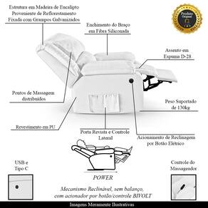Que tal criar seu próprio home cinema? Aqui, vamos mostrar como você pode montar o seu! Com o local adequado, alguns itens decorativos e uma poltrona ideal, você garantirá um espaço confortável e imersivo. O primeiro passo é investir em equipamentos de alta qualidade! Olha só que lindeza a nossa Poltrona do Papai Reclinável Melim. Ela foi projetada para proporcionar máximo conforto e funcionalidade, esta poltrona é a escolha ideal para quem busca relaxamento, estilo e uma experiência de cinema privada. A praticidade do ajuste elétrico conta com acionamento de reclinagem por botão power elétrico Bivolt em uma das Braças, com apenas um toque, proporcionando a posição ideal, criando uma experiência incomparável. A presença do botão elétrico e do controle de massagem eleva o nível de relaxamento, proporcionando uma experiência cinematográfica aliada aos benefícios terapêuticos de uma massagem. Com capacidade para suportar até 130 kg, oferecendo segurança e estabilidade ao consumidor. O revestimento em PU Branco oferece um toque de sofisticação e conforto, enquanto a estrutura em Madeira de Lei Eucalipto com Controle de Umidade, Proveniente de Reflorestamento, Fixa com Grampos Galvanizados garante resistência e durabilidade. O encosto e o assento são sustentados por percintas elásticas. O braço/assento possui Enchimento em Fibra Siliconada. O assento foi preenchido com espuma D-28, respectivamente, para um conforto adicional. O assento (fixo) e o apoio de Pés Retrátil proporcionam um apoio perfeito para suas pernas, aumentando o conforto. O encosto reclinável, possibilita ajustá- lo para a posição ideal de relaxamento. Já os pés (fixos) foram feitos em aço revestido com plástico, adicionando um toque de elegância ao produto. E tem mais!! A poltrona também possui uma saída USB, que permite que você carregue seu celular ou tablet enquanto você relaxa. Ela contém Bolso lateral nas braças perfeito para armazenar livros e revistas, mantendo tudo ao seu alcance. Com um design moderno e prático, esta poltrona se tornará o destaque da sua sala de estar. Afinal, sua casa merece a Poltrona do Papai Reclinável Melim Power Elétrica Massagem. Adquira a sua agora mesmo e transforme sua sala de estar em um verdadeiro cinema!