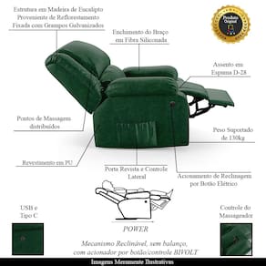 Que tal criar seu próprio home cinema? Aqui, vamos mostrar como você pode montar o seu! Com o local adequado, alguns itens decorativos e uma poltrona ideal, você garantirá um espaço confortável e imersivo. O primeiro passo é investir em equipamentos de alta qualidade! Olha só que lindeza a nossa Poltrona do Papai Reclinável Melim. Ela foi projetada para proporcionar máximo conforto e funcionalidade, esta poltrona é a escolha ideal para quem busca relaxamento, estilo e uma experiência de cinema privada. A praticidade do ajuste elétrico conta com acionamento de reclinagem por botão power elétrico Bivolt em uma das Braças, com apenas um toque, proporcionando a posição ideal, criando uma experiência incomparável. A presença do botão elétrico e do controle de massagem eleva o nível de relaxamento, proporcionando uma experiência cinematográfica aliada aos benefícios terapêuticos de uma massagem. Com capacidade para suportar até 130 kg, oferecendo segurança e estabilidade ao consumidor. O revestimento em PU Verde Musgo oferece um toque de sofisticação e conforto, enquanto a estrutura em Madeira de Lei Eucalipto com Controle de Umidade, Proveniente de Reflorestamento, Fixa com Grampos Galvanizados garante resistência e durabilidade. O encosto e o assento são sustentados por percintas elásticas. O braço/assento possui Enchimento em Fibra Siliconada. O assento foi preenchido com espuma D-28, respectivamente, para um conforto adicional. O assento (fixo) e o apoio de Pés Retrátil proporcionam um apoio perfeito para suas pernas, aumentando o conforto. O encosto reclinável, possibilita ajustá- lo para a posição ideal de relaxamento. Já os pés (fixos) foram feitos em aço revestido com plástico, adicionando um toque de elegância ao produto. E tem mais!! A poltrona também possui uma saída USB, que permite que você carregue seu celular ou tablet enquanto você relaxa. Ela contém Bolso lateral nas braças perfeito para armazenar livros e revistas, mantendo tudo ao seu alcance. Com um design moderno e prático, esta poltrona se tornará o destaque da sua sala de estar. Afinal, sua casa merece a Poltrona do Papai Reclinável Melim Power Elétrica Massagem. Adquira a sua agora mesmo e transforme sua sala de estar em um verdadeiro cinema!