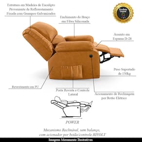 Que tal criar seu próprio home cinema? Aqui, vamos mostrar como você pode montar o seu! Com o local adequado, alguns itens decorativos e uma poltrona ideal, você garantirá um espaço confortável e imersivo. O primeiro passo é investir em equipamentos de alta qualidade! Olha só que lindeza a nossa Poltrona do Papai Reclinável Melim. Ela foi projetada para proporcionar máximo conforto e funcionalidade, esta poltrona é a escolha ideal para quem busca relaxamento, estilo e uma experiência de cinema privada. A praticidade do ajuste elétrico conta com acionamento de reclinagem por botão power elétrico Bivolt em uma das Braças, com apenas um toque, proporcionando a posição ideal, criando uma experiência incomparável. Com capacidade para suportar até 130 kg, oferecendo segurança e estabilidade ao consumidor. O revestimento em PU oferece um toque de sofisticação e conforto, enquanto a estrutura em Madeira de Lei Eucalipto com Controle de Umidade, Proveniente de Reflorestamento, Fixa com Grampos Galvanizados garante resistência e durabilidade. O encosto e o assento são sustentados por percintas elásticas. O braço/assento possui Enchimento em Fibra Siliconada. O assento foi preenchido com espuma D-28, respectivamente, para um conforto adicional. O assento (fixo) e o apoio de Pés Retrátil proporcionam um apoio perfeito para suas pernas, aumentando o conforto. O encosto reclinável, possibilita ajustá- lo para a posição ideal de relaxamento. Já os pés (fixos) foram feitos em aço revestido com plástico, adicionando um toque de elegância ao produto. E tem mais!! Ela contém Bolso lateral nas braças perfeito para armazenar livros e revistas, mantendo tudo ao seu alcance. Com um design moderno e prático, esta poltrona se tornará o destaque da sua sala de estar. Afinal, sua casa merece a Poltrona do Papai Reclinável Melim Power Elétrica. Adquira a sua agora mesmo e transforme sua sala de estar em um verdadeiro cinema!