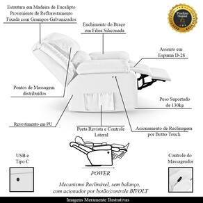 Que tal criar seu próprio home cinema? Aqui, vamos mostrar como você pode montar o seu! Com o local adequado, alguns itens decorativos e uma poltrona ideal, você garantirá um espaço confortável e imersivo. O primeiro passo é investir em equipamentos de alta qualidade! Olha só que lindeza a nossa Poltrona do Papai Reclinável Melim. Ela foi projetada para proporcionar máximo conforto e funcionalidade, esta poltrona é a escolha ideal para quem busca relaxamento, estilo e uma experiência de cinema privada. Com a conveniência do ajuste elétrico por meio de um Power botão touch Bivolt em uma das Braças, é possível encontrar a posição ideal com um simples toque, proporcionando uma experiência imersiva única e sem comparações. A presença do botão elétrico e do controle de massagem eleva o nível de relaxamento, proporcionando uma experiência cinematográfica aliada aos benefícios terapêuticos de uma massagem. Contém também uma saída USB, que permite que você carregue seu celular enquanto relaxa. Ela conta com capacidade para suportar até 130 kg, oferecendo segurança e estabilidade ao consumidor. O revestimento em Sintético PU Branco oferece um toque de sofisticação e conforto, enquanto a estrutura em Madeira de Lei Eucalipto com Controle de Umidade, Proveniente de Reflorestamento, Fixa com Grampos Galvanizados garante resistência e durabilidade. O braço Braço foi preenchido em Fibra Siliconada e assento/encosto foi preenchido com espuma D-28, respectivamente, para um conforto adicional. O assento (fixo) e o apoio de Pés Retrátil proporcionam um apoio perfeito para suas pernas, aumentando o conforto. O encosto reclinável, possibilita ajustá- lo para a posição ideal de relaxamento. Já os pés fixos foram feitos em aço revestido com plástico, adicionando um toque de elegância ao produto. E tem mais!! Ela contém Bolso lateral para revistas e controle nas braças perfeito para armazenar livros e outros objetos, mantendo tudo ao seu alcance. Com um design moderno e prático, esta poltrona se tornará o destaque da sua sala de estar. Afinal, sua casa merece a Poltrona do Papai Reclinável Melim Power Touch Massagem. Adquira a sua agora mesmo e transforme sua sala de estar em um verdadeiro cinema!