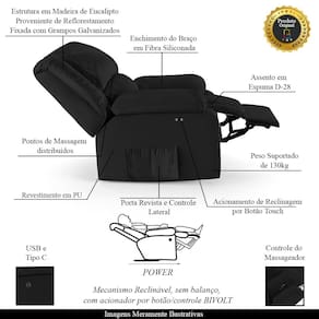 Que tal criar seu próprio home cinema? Aqui, vamos mostrar como você pode montar o seu! Com o local adequado, alguns itens decorativos e uma poltrona ideal, você garantirá um espaço confortável e imersivo. O primeiro passo é investir em equipamentos de alta qualidade! Olha só que lindeza a nossa Poltrona do Papai Reclinável Melim. Ela foi projetada para proporcionar máximo conforto e funcionalidade, esta poltrona é a escolha ideal para quem busca relaxamento, estilo e uma experiência de cinema privada. Com a conveniência do ajuste elétrico por meio de um Power botão touch Bivolt em uma das Braças, é possível encontrar a posição ideal com um simples toque, proporcionando uma experiência imersiva única e sem comparações. A presença do botão elétrico e do controle de massagem eleva o nível de relaxamento, proporcionando uma experiência cinematográfica aliada aos benefícios terapêuticos de uma massagem. Contém também uma saída USB, que permite que você carregue seu celular enquanto relaxa. Ela conta com capacidade para suportar até 130 kg, oferecendo segurança e estabilidade ao consumidor. O revestimento em Sintético PU Preto oferece um toque de sofisticação e conforto, enquanto a estrutura em Madeira de Lei Eucalipto com Controle de Umidade, Proveniente de Reflorestamento, Fixa com Grampos Galvanizados garante resistência e durabilidade. O braço Braço foi preenchido em Fibra Siliconada e assento/encosto foi preenchido com espuma D-28, respectivamente, para um conforto adicional. O assento (fixo) e o apoio de Pés Retrátil proporcionam um apoio perfeito para suas pernas, aumentando o conforto. O encosto reclinável, possibilita ajustá- lo para a posição ideal de relaxamento. Já os pés fixos foram feitos em aço revestido com plástico, adicionando um toque de elegância ao produto. E tem mais!! Ela contém Bolso lateral para revistas e controle nas braças perfeito para armazenar livros e outros objetos, mantendo tudo ao seu alcance. Com um design moderno e prático, esta poltrona se tornará o destaque da sua sala de estar. Afinal, sua casa merece a Poltrona do Papai Reclinável Melim Power Touch Massagem. Adquira a sua agora mesmo e transforme sua sala de estar em um verdadeiro cinema!