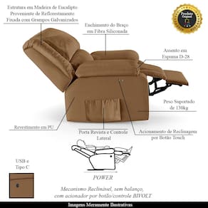 Que tal criar seu próprio home cinema? Aqui, vamos mostrar como você pode montar o seu! Com o local adequado, alguns itens decorativos e uma poltrona ideal, você garantirá um espaço confortável e imersivo. O primeiro passo é investir em equipamentos de alta qualidade! Olha só que lindeza a nossa Poltrona do Papai Reclinável Melim. Ela foi projetada para proporcionar máximo conforto e funcionalidade, esta poltrona é a escolha ideal para quem busca relaxamento, estilo e uma experiência de cinema privada. Com a conveniência do ajuste elétrico por meio de um Power botão touch Bivolt em uma das Braças, é possível encontrar a posição ideal com um simples toque, proporcionando uma experiência imersiva única e sem comparações. Contém também uma saída USB, que permite que você carregue seu celular enquanto relaxa. Ela conta com capacidade para suportar até 130 kg, oferecendo segurança e estabilidade ao consumidor. O revestimento em Sintético PU Caramelo oferece um toque de sofisticação e conforto, enquanto a estrutura em Madeira de Lei Eucalipto com Controle de Umidade, Proveniente de Reflorestamento, Fixa com Grampos Galvanizados garante resistência e durabilidade. O braço Braço foi preenchido em Fibra Siliconada e assento/encosto foi preenchido com espuma D-28, respectivamente, para um conforto adicional. O assento (fixo) e o apoio de Pés Retrátil proporcionam um apoio perfeito para suas pernas, aumentando o conforto. O encosto reclinável, possibilita ajustá- lo para a posição ideal de relaxamento. Já os pés fixos foram feitos em aço revestido com plástico, adicionando um toque de elegância ao produto. E tem mais!! Ela contém Bolso lateral para revistas e controle nas braças perfeito para armazenar livros e outros objetos, mantendo tudo ao seu alcance. Com um design moderno e prático, esta poltrona se tornará o destaque da sua sala de estar. Afinal, sua casa merece a Poltrona do Poltrona do Papai Reclinável Melim Power Touch USB. Adquira a sua agora mesmo e transforme sua sala de estar em um verdadeiro cinema!