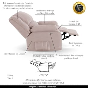 Poltrona do Papai Reclinável Melim Power Touch USB Veludo Rosê FH1 - D`Rossi