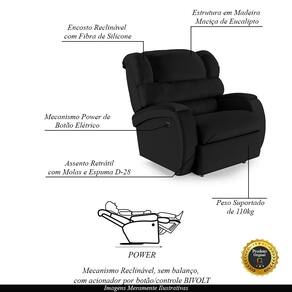 Que tal criar seu próprio home cinema? Aqui, vamos mostrar como você pode montar o seu! Com o local adequado, alguns itens decorativos e uma poltrona ideal, você garantirá um espaço confortável e imersivo. O primeiro passo é investir em equipamentos de alta qualidade! Olha só que lindeza a nossa Poltrona Reclinável do Papai Napoli. Ela foi projetada para proporcionar máximo conforto e funcionalidade, esta poltrona é a escolha ideal para quem busca relaxamento, estilo e uma experiência de cinema privada. Com capacidade para suportar até 110 kg oferecendo segurança e estabilidade ao consumidor. O revestimento em Sintético PU Preto oferece um toque de sofisticação e conforto, enquanto a estrutura em Madeira Maciça de Eucalipto garante resistência e durabilidade. O sistema de abertura fácil permite ajustar a poltrona sem esforço: basta acionar o mecanismo power com controle de acionamento Bi-volt, onde possibilita que você encontre a posição perfeita com um simples toque de um botão. O encosto e o assento são sustentados por fibra siliconada e espuma D-28, no assento também possui Molas respectivamente para um conforto adicional. O assento (fixo) e o apoio de Pés Retrátil proporcionam um apoio perfeito para suas pernas, aumentando o conforto. O encosto reclinável, possibilita ajustá- lo para a posição ideal de relaxamento. Já os pés (fixos) foram feitos em madeira e revestidos em alumínio cromado, adicionando um toque de elegância ao produto. Com um design moderno e prático, esta poltrona se tornará o destaque da sua sala de estar. Afinal, sua casa merece a Poltrona do Papai Reclinável Napoli Controle Power Elétrico. Adquira a sua agora mesmo e transforme sua sala de estar em um verdadeiro cinema!