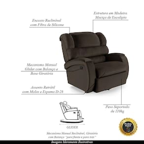 Que tal criar seu próprio home cinema? Aqui, vamos mostrar como você pode montar o seu! Com o local adequado, alguns itens decorativos e uma poltrona ideal, você garantirá um espaço confortável e imersivo. O iro passo é investir em equipamentos de alta qualidade! Olha só que lindeza a nossa Poltrona do Papai Reclinável Napoli. Ela foi projetada para proporcionar máximo conforto e funcionalidade, esta poltrona é a escolha ideal para quem busca relaxamento, estilo e uma experiência de cinema privada. A poltrona com sistema glider, encosto reclinável e apoio para os pés manual oferece um relaxamento total, sendo giratória e com balanço suave. Este ajuste é feito manualmente, utilizando um gatilho localizado na lateral da poltrona. Ao puxar ou pressionar esse gatilho, o usuário pode reclinar o encosto ou levantar o apoio para os pés, ajustando a poltrona à posição desejada. Com capacidade para suportar até 110 kg, oferecendo segurança e estabilidade ao consumidor. O revestimento em PU oferece um toque de sofisticação e conforto, enquanto a estrutura em Madeira Maciça de Eucalipto. O assento foi preenchido com fibra siliconada e espuma D-28, respectivamente, para um conforto adicional. O assento (fixo) e o apoio de Pés Retrátil proporcionam um apoio perfeito para suas pernas, aumentando o conforto. O encosto reclinável, possibilita ajustá- lo para a posição ideal de relaxamento. Já os pés giratórios foram feitos em aço revestido com plástico, adicionando um toque de elegância ao produto. Com um design moderno e prático, esta poltrona se tornará o destaque da sua sala de estar. Afinal, sua casa merece a Poltrona do Papai Reclinável Napoli Glider Giratória. Adquira a sua agora mesmo e transforme sua sala de estar em um verdadeiro cinema!