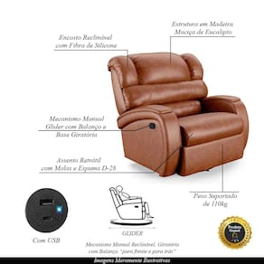 Que tal criar seu próprio home cinema? Aqui, vamos mostrar como você pode montar o seu! Com o local adequado, alguns itens decorativos e uma poltrona ideal, você garantirá um espaço confortável e imersivo. O primeiro passo é investir em equipamentos de alta qualidade! Olha só que lindeza a nossa Poltrona do Papai Reclinável Napoli. Ela foi projetada para proporcionar máximo conforto e funcionalidade, esta poltrona é a escolha ideal para quem busca relaxamento, estilo e uma experiência de cinema privada. A poltrona com sistema glider, encosto reclinável e apoio para os pés manual oferece um relaxamento total, sendo giratória e com balanço suave. Este ajuste é feito manualmente, utilizando um gatilho localizado na lateral da poltrona. Ao puxar ou pressionar esse gatilho, o usuário pode reclinar o encosto ou levantar o apoio para os pés, ajustando a poltrona à posição desejada. Além disso, possui USB trazendo praticidade na hora de carregar seu celular sem sair do seu conforto. Com capacidade para suportar até 110 kg, oferecendo segurança e estabilidade ao consumidor. O revestimento em PU Caramelo Brilho oferece um toque de sofisticação e conforto, enquanto a estrutura em Madeira Maciça de Eucalipto. O encosto foi preenchido com fibra siliconada, no assento contém espuma D-28, respectivamente, para um conforto adicional. O assento (fixo) e o apoio de Pés Retrátil proporcionam um apoio perfeito para suas pernas, aumentando o conforto. O encosto reclinável, possibilita ajustá- lo para a posição ideal de relaxamento. Já os pés giratórios foram feitos em aço revestido com plástico, adicionando um toque de elegância ao produto. Com um design moderno e prático, esta poltrona se tornará o destaque da sua sala de estar. Afinal, sua casa merece a Poltrona do Papai Reclinável Napoli Glider Giratória USB. Adquira a sua agora mesmo e transforme sua sala de estar em um verdadeiro cinema!