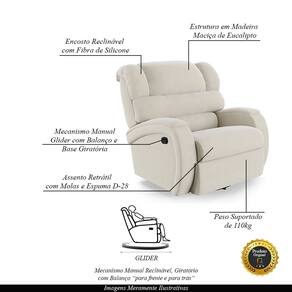Que tal criar seu próprio home cinema? Aqui, vamos mostrar como você pode montar o seu! Com o local adequado, alguns itens decorativos e uma poltrona ideal, você garantirá um espaço confortável e imersivo. O primeiro passo é investir em equipamentos de alta qualidade! Olha só que lindeza a nossa Poltrona do Papai Reclinável Napoli. Ela foi projetada para proporcionar máximo conforto e funcionalidade, esta poltrona é a escolha ideal para quem busca relaxamento, estilo e uma experiência de cinema privada. A poltrona com sistema glider, encosto reclinável e apoio para os pés manual oferece um relaxamento total, sendo giratória e com balanço suave. Este ajuste é feito manualmente, utilizando um gatilho localizado na lateral da poltrona. Ao Veludoxar ou pressionar esse gatilho, o usuário pode reclinar o encosto ou levantar o apoio para os pés, ajustando a poltrona à posição desejada. Com capacidade para suportar até 110 kg, oferecendo segurança e estabilidade ao consumidor. O revestimento em Veludo Bege oferece um toque de sofisticação e conforto, enquanto a estrutura em Madeira Maciça de Eucalipto. O assento foi preenchido com fibra siliconada e esVeludoma D-28, respectivamente, para um conforto adicional. O assento (fixo) e o apoio de Pés Retrátil proporcionam um apoio perfeito para suas pernas, aumentando o conforto. O encosto reclinável, possibilita ajustá- lo para a posição ideal de relaxamento. Já os pés giratórios foram feitos em aço revestido com plástico, adicionando um toque de elegância ao produto. Com um design moderno e prático, esta poltrona se tornará o destaque da sua sala de estar. Afinal, sua casa merece a Poltrona do Papai Reclinável Napoli Glider Giratória. Adquira a sua agora mesmo e transforme sua sala de estar em um verdadeiro cinema!