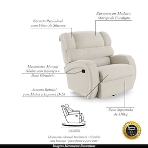 Que tal criar seu próprio home cinema? Aqui, vamos mostrar como você pode montar o seu! Com o local adequado, alguns itens decorativos e uma poltrona ideal, você garantirá um espaço confortável e imersivo. O iro passo é investir em equipamentos de alta qualidade! Olha só que lindeza a nossa Poltrona do Papai Reclinável Napoli. Ela foi projetada para proporcionar máximo conforto e funcionalidade, esta poltrona é a escolha ideal para quem busca relaxamento, estilo e uma experiência de cinema privada. A poltrona com sistema glider, encosto reclinável e apoio para os pés manual oferece um relaxamento total, sendo giratória e com balanço suave. Este ajuste é feito manualmente, utilizando um gatilho localizado na lateral da poltrona. Ao Veludoxar ou pressionar esse gatilho, o usuário pode reclinar o encosto ou levantar o apoio para os pés, ajustando a poltrona à posição desejada. Com capacidade para suportar até 110 kg, oferecendo segurança e estabilidade ao consumidor. O revestimento em Veludo oferece um toque de sofisticação e conforto, enquanto a estrutura em Madeira Maciça de Eucalipto. O assento foi preenchido com fibra siliconada e esVeludoma D-28, respectivamente, para um conforto adicional. O assento (fixo) e o apoio de Pés Retrátil proporcionam um apoio perfeito para suas pernas, aumentando o conforto. O encosto reclinável, possibilita ajustá- lo para a posição ideal de relaxamento. Já os pés giratórios foram feitos em aço revestido com plástico, adicionando um toque de elegância ao produto. Com um design moderno e prático, esta poltrona se tornará o destaque da sua sala de estar. Afinal, sua casa merece a Poltrona do Papai Reclinável Napoli Glider Giratória. Adquira a sua agora mesmo e transforme sua sala de estar em um verdadeiro cinema!