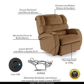 Que tal criar seu próprio home cinema? Aqui, vamos mostrar como você pode montar o seu! Com o local adequado, alguns itens decorativos e uma poltrona ideal, você garantirá um espaço confortável e imersivo. O primeiro passo é investir em equipamentos de alta qualidade! Olha só que lindeza a nossa Poltrona do Papai Reclinável Napoli. Ela foi projetada para proporcionar máximo conforto e funcionalidade, esta poltrona é a escolha ideal para quem busca relaxamento, estilo e uma experiência de cinema privada. A facilidade de ajuste com o botão elétrico com LED permite que você encontre a posição perfeita com o toque suave de um botão touch, pensado para proporcionar uma experiência imersiva sem igual. Além disso, possui USB trazendo praticidade na hora de carregar seu celular sem sair do seu conforto. Ela conta com capacidade para suportar até 110 kg, oferecendo segurança e estabilidade ao consumidor. O revestimento em PU Caramelo oferece um toque de sofisticação e conforto, enquanto a estrutura em Composta por Madeira Maciça de Eucalipto garante resistência e durabilidade. O encosto foi preenchido com fibra siliconada. O assento foi preenchido com molas e espuma D-28, respectivamente, para um conforto adicional. O assento e o apoio de Pés Retrátil proporcionam um apoio perfeito para suas pernas, aumentando o conforto. Já os pés fixos foram feitos em aço revestido com plástico, adicionando um toque de elegância ao produto. Com um design moderno e prático, esta poltrona se tornará o destaque da sua sala de estar. Afinal, sua casa merece a Poltrona do Papai Reclinável Napoli Power Touch USB. Adquira a sua agora mesmo e transforme sua sala de estar em um verdadeiro cinema!