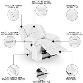 Madeira de EucaliptoHora de deixar a sua Sala De Estar mais moderna e transformar em um espaço de entretenimento de última geração com a Poltrona do Papai Reclinável Pietra Elétrica LED FH9 PU Branco, da Mpozenato!
