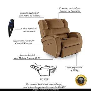 Dimensões do Produto:Largura: 93cmAltura: 95cmProfundidade: 96cmProfundidade Aberto: 169cmAltura do Encosto: 62cmAltura do Assento até o Chão: 46cm Características do Produto:Estrutura: Composta por Madeira Maciça de Eucalipto;Assento: com Molas e Espuma D-28;Encosto: Reclinável com Enchimento em Fibra de Silicone;Mecanismo: Controle Elétrico Bi Volt;Tipo de Base: Fixa;Material dos Pés: Aço Revestido com Plástico;Revestimento: PU;Peso Suportado: 110kg;Conteúdo da Embalagem: 1 Poltrona;Necessita de Montagem: Não;Instruções/Cuidado: Recomendado somente limpeza com pano umedecido;