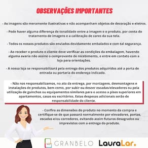 - Confira as dimensões do produto no momento da compra e certifique-se de que passará normalmente por elevadores, portas, escadas e/ou corredores, evitando assim futuros desagrados ou imprevistos com a entrega do produto.
