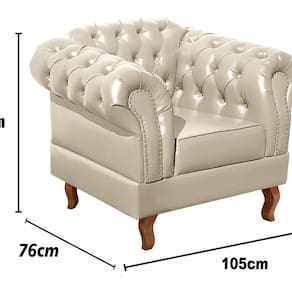 Não rasgue a embalagem antes de ter certeza que ficará com tudo. Acompanha Almofadas extras: Não Acompanha Puff: Não Almofada do assento: Removível Almofada do encosto: Não Possui Altura do assento até o chão: 41 cm Altura do Encosto: 82 cm Ambiente Principal: Sala de Estar Complexidade da Montagem: Baixa: pode ser montado por uma pessoa sozinha Cor: Bege Cor do Produto: Bege Design Assinado: Não Enchimento do Assento: Espuma D-26 Enchimento do Braço: Espuma D-26 Encosto para a Cabeça: Não Estampado: Não Extensível: Não Firmeza do Assento: Médio Informações Complementares: 120Kg por acento Itens Inclusos: 1 Poltrona Dom Pedro (incluindo seus respectivos pés apenas pra enroscar) Linha ou Coleção: Chesterfield Material do Braço: Madeira Eucalipto Material dos Pés: Madeira Eucalípto Modelo de Poltrona: Fixo Necessita Montagem: Sim Origem do Produto: Nacional Peso: 35 kg Possui Percintas Elásticas: Sim Possui Pés: 04 Possui Rodízio: Não Recomendações de Uso, Manutenção e Limpeza: Limpeza e cuidados: pode ser utilizado aspirador de pó, escova com cerdas macias ou limpeza a seco. Não utilizar produtos químicos, abrasivos ou limpeza a vapor. Evitar exposição prolongada ao sol. Sistema de Montagem: Enroscar os Pés Suporta Até (kg): 120 kg Tecido Predominante: Couro Sintético Tipo de Assento: Fixo Tipo de Encosto: Fixo Tipo de Espuma do Assento: Espuma Convencional Tipo de Poltrona: Decorativa