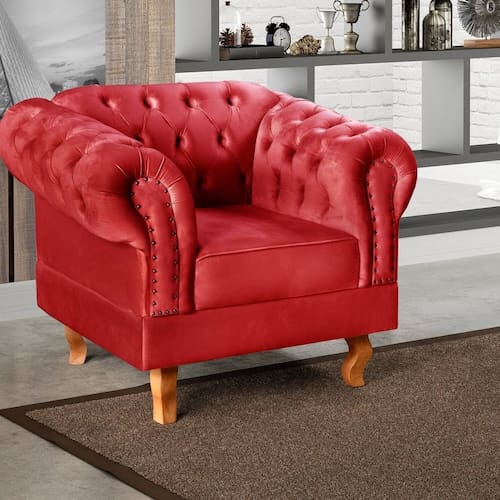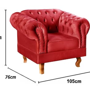 Não rasgue a embalagem antes de ter certeza que ficará com tudo. Acompanha Almofadas extras: Não Acompanha Puff: Não Almofada do assento: Removível Almofada do encosto: Não Possui Altura do assento até o chão: 41 cm Altura do Encosto: 82 cm Ambiente Principal: Sala de Estar Complexidade da Montagem: Baixa: pode ser montado por uma pessoa sozinha Cor: Vermelho Cor do Produto: Vermelho Design Assinado: Não Enchimento do Assento: Espuma D-26 Enchimento do Braço: Espuma D-26 Encosto para a Cabeça: Não Estampado: Não Extensível: Não Firmeza do Assento: Médio Informações Complementares: 120Kg por acento Itens Inclusos: 1 Poltrona Dom Pedro (incluindo seus respectivos pés apenas pra enroscar) Linha ou Coleção: Chesterfield Material do Braço: Madeira Eucalipto Material dos Pés: Madeira Eucalípto Modelo de Poltrona: Fixo Necessita Montagem: Sim Origem do Produto: Nacional Peso: 35 kg Possui Percintas Elásticas: Sim Possui Pés: 04 Possui Rodízio: Não Recomendações de Uso, Manutenção e Limpeza: Limpeza e cuidados: pode ser utilizado aspirador de pó, escova com cerdas macias ou limpeza a seco. Não utilizar produtos químicos, abrasivos ou limpeza a vapor. Evitar exposição prolongada ao sol. Sistema de Montagem: Enroscar os Pés Suporta Até (kg): 120 kg Tecido Predominante: Suede Tipo de Assento: Fixo Tipo de Encosto: Fixo Tipo de Espuma do Assento: Espuma Convencional Tipo de Poltrona: Decorativa