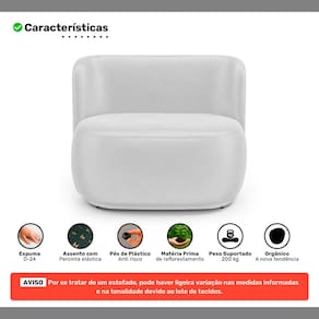 Estrutura: Madeira de Eucalipto; Estofamento: Espuma D-24; Revestimento: Couríssimo Sintético (PU); Pés: PlásticoPoltrona e Namoradeira Orgânica Molly - Conforto, elegância e estilo orgânico para transformar seu ambiente!