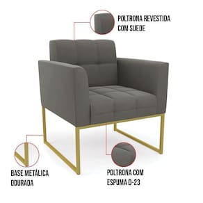 Você gosta de colecionar vários momentos memoráveis com sua família e amigos? Que tal recebê-los, com móveis de altíssima qualidade que só a DRossi tem? A Poltrona Elisa é adequada para você! Seu design retrô é a grande tendência do momento. Pode ser usada em diversos espaços da casa, em salas, hall de entrada, quartos, cozinhas, varanda, sacada, escritório, dentre outros. Contém as seguintes características: A estrutura é feita de madeira de Eucalipto 100% de reflorestamento, e a Base Industrial Metálica Dourada, além de ser resistente e durável, suporta em média até 120 kg. Assento, encosto e braços, contém enchimento de espuma D-23 e é estofada em tecido Suede, que oferece muito conforto e resistência ao sentar, com aquela sensação de maciez e aconchego. Possui também, detalhes de costura no encosto e assento, resultando em um acabamento impecável, conferindo muito mais valor e elegância ao seu espaço. Para complementar a decoração com essa linda poltrona, a dica é utilizar mantas, almofadas ou vasinho de flor. E pronto, seu cantinho estará perfeito para descansar e relaxar! Aqui, você encontra várias opções, para que seus amigos e familiares se sintam acolhidos. Garanta já sua Poltrona.