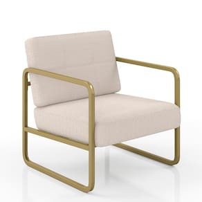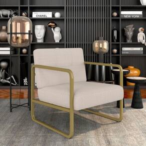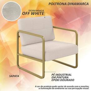 Detalhes Técnicos da Poltrona - Assento e Encosto Tapeçados, Estofados e Fixos - Espuma do Assento e do Encosto: D20 - Tonalidade Estrutura: Dourado - Tonalidade Estofado: Bouclé Off White - Material: Metalon - Medida Poltrona: A:80CM x L:69CM x P:68CM - Altura do Assento ao Chão: 39,5CM - Poltrona suporta até 120KG
