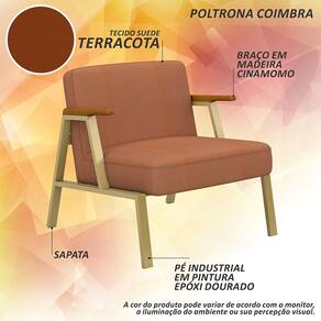 Detalhes Técnicos das Poltronas - Assento e Encosto Tapeçados, Estofados e Fixos - Espuma do Assento e do Encosto: D20 - Tonalidade da Estrutura: Dourado/Cinamomo -Tonalidade do Tecido: Suede Terracota - Material: Estrutura em Metalon | Braço em Madeira - Medida Poltrona: A: 72CM x L: 78CM x P: 73CM - Medida do chão até o assento: 42cm de altura - Poltrona suporta até 120KG - Montagem: Difícil