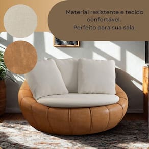 Seu revestimento em linho Compose bege transmite leveza e sofisticação, enquanto a base em courino caramelo oferece um contraste visual quente e atual, ideal para ambientes integrados e bem iluminados. A estrutura arredondada promove uma sensação de acolhimento imediato quase como um ninho de tranquilidade no seu living.