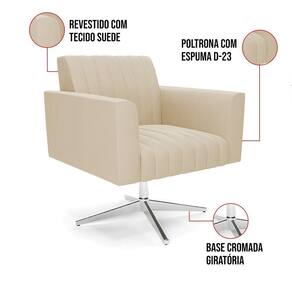 Poltrona Giratória Viena Gomada Suede Bege Base Cromada - D'rossi Quer uma decoração única e sofisticada? A Poltrona Viena é ideal para quem está em busca de um móvel versátil e diferenciado. Esse tipo de peça é ideal para ambientes modernos e descontraídos. Vem com uma ideia totalmente diferente, devido sua curva e forma suave, os detalhes gomados do tecido são tendências de decoração atuais. O tom Bege vem ganhando cada vez mais espaço no mercado, uma cor que traz elegância e combina com vários tipos de decoração. Uma dica legal de complemento é escolher almofadas que combinem com a poltrona. Sua estrutura é confeccionada em madeira de eucalipto proveniente de reflorestamento, o estofamento do assento é composto de espuma prorelax D-23 no encosto, e é revestido em Suede um tecido aconchegante, resistente e extremamente luxuoso. Sua sustentação é dada pela Base Giratória Cromada, suportando em média até 120 Kg. Crie um lindo efeito visual, em qualquer lugar da sua casa ou escritório! Garanta já sua Poltrona Viena. Dimensões da Poltrona:
