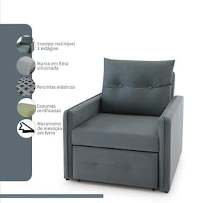 Assentos com espuma flexível de poliuretano densidade 23kg/m, certificada, fabricação própria, utilização de feltro como camada isolante, sustentados por percinta elástica. Com assento retrátil e encosto com 3 estagio de declínio ele deita totalmente virando uma cama. Enchimento do encosto: espuma D-23 e fibra de poliéster siliconada. Estrutura de madeira maciça de pinus e eucalipto 100% reflorestada. Fixação da estrutura: grampos galvanizados anti-ferrugem. Apoiados no chão com sapatas de pvc. Revestimento/tecido: suede 100% poliéster, com toque macio.