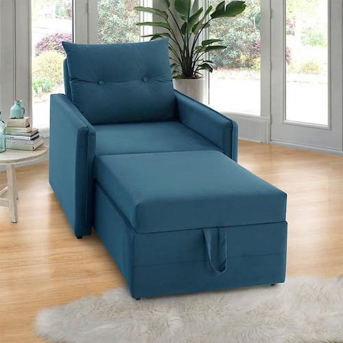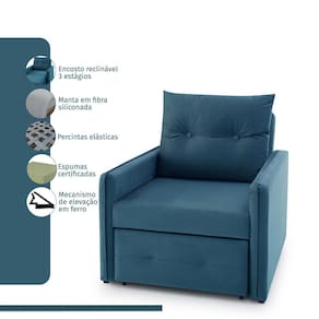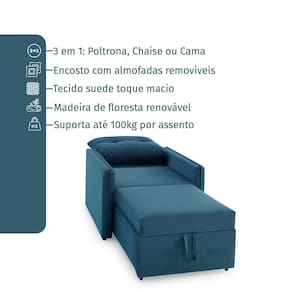 Assentos com espuma flexível de poliuretano densidade 23kg/m, certificada, fabricação própria, utilização de feltro como camada isolante, sustentados por percinta elástica. Com assento retrátil e encosto com 3 estagio de declínio ele deita totalmente virando uma cama. Enchimento do encosto: espuma D-23 e fibra de poliéster siliconada. Estrutura de madeira maciça de pinus e eucalipto 100% reflorestada. Fixação da estrutura: grampos galvanizados anti-ferrugem. Apoiados no chão com sapatas de pvc. Revestimento/tecido: suede 100% poliéster, com toque macio.