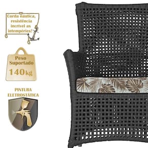 A corda nautica adiciona um toque de rusticidade moderna, enquanto o estofado impermeavel garante que sua poltrona esteja sempre impecavel, mesmo apos uma chuva inesperada ou um acidente com liquidos.