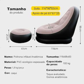Com dimensões de 80 cm de altura, 140 cm de comprimento e 86 cm de largura, esta poltrona inflável é compacta e fácil de transportar, tornando-a perfeita para camping ou para levar para a praia. Além disso, o conjunto inclui um pufe, proporcionando ainda mais conforto.