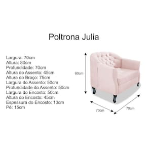 Gostaria de um móvel que trouxesse mais elegância e sofisticação para o seu lar? A Poltrona Julia A02 é sua melhor opção! Com característica moderna e com acabamento de qualidade, este produto atenderá suas expectativas! Não perca essa oportunidade e adquira já a sua!Especificações Técnicas da Poltrona Julia A02: - Altura: 80 cm;- Largura Total: 69 cm;- Profundidade: 70 cm;- Peso: 20 Kg;- Peso Suportado: 120 Kg;Diferenciais da Poltrona Julia A02: - Material da Estrutura: fabricado com Madeira Pinus e Eucalipto Reflorestada, e alguns detalhes em MDF;- Tipo de Assento: Estofado e com espuma de densidade D-26;- Tipo de Encosto: Estofado e com espuma de densidade D-18;- Detalhes do Pé: acompanham pés de madeira de alta resistência;Recomendações de limpeza: -Limpar com flanela limpa e seca. Não molhar o móvel e não expor em lugar úmido ou próximo de fontes de calor. Não usar produtos abrasivos.Observações Importantes: - As imagens ambientadas são meramente ilustrativas e podem apresentar itens que não compõe o produto;- Objetos decorativos que aparecem na foto não acompanham o produto;- As cores do produto podem variar de acordo com o monitor, a iluminação do ambiente, ou sua percepção visual;- A Poltrona Julia A02 chegará montado para você, bastando encaixar os pés;- Confira as dimensões antes da compra e certifique-se de que o produto passará por elevadores, portas e corredores;- Ao receber seus produtos, verifique no ato do recebimento qualquer dano na embalagem;- Produto para uso residencial em ambiente interno, não devendo ficar exposto diretamente ao sol, calor e umidades excessivas.