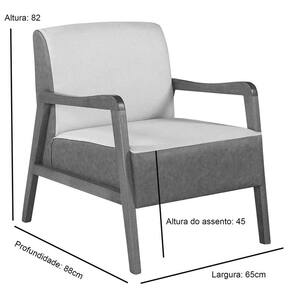 Altura 82 cm Profundidade 88 cm Largura 65 cm Quantidade de lugares 1 Peso suportado por assento 120 kg Tecido Linho Premium Material da Estrutura Eucalipto Assento Percintas elásticas, espuma D26 soft (qualidade contínua 5 cm espessura) Tipo do Encosto Fixo com espuma D26 Soft de 4 cm Base / Braço