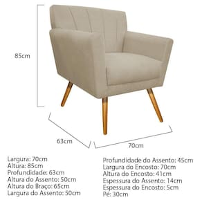 Gostaria de um móvel que trouxesse mais elegância e sofisticação para o seu lar? A Poltrona Laura é sua melhor opção! Com característica moderna e com acabamento de qualidade, este produto atenderá suas expectativas! Não perca essa oportunidade e adquira já a sua! Especificações Técnicas da Poltrona Decorativa Laura: - Altura: 85 cm; - Largura: 70 cm; - Profundidade: 63 cm; - Altura do Assento: 50 cm; - Largura do Assento: 50 cm; - Altura do Braço: 65 cm; - Profundidade do Assento: 45 cm; - Largura do Encosto: 70 cm; - Espessura do Assento: 14 cm; - Altura do Encosto: 41 cm; - Espessura do Encosto: 5 cm; - Altura dos Pés: 30 cm; - Peso: 20 kg. - Peso Suportado: 120 kg. Diferenciais da Poltrona Decorativa Laura: - Material da Estrutura: fabricado com Madeira Pinus e Eucalipto Reflorestada, e alguns detalhes em MDF; - Tipo de Assento: estofado e com espuma de densidade D-26; - Tipo de Encosto: estofado e com espuma de densidade D-18; - Detalhes dos Pés: acompanha kit de pés (4 pés) de madeira, no estilo palito na cor mel, com alta resistência; - Volumes: nessa compra você receberá um único produto. Recomendações de limpeza: -Limpar com flanela limpa e seca. Não molhar o móvel e não expor em lugar úmido ou próximo de fontes de calor. Não usar produtos abrasivos. Observações Importantes: - As imagens ambientadas são meramente ilustrativas e podem apresentar itens que não compõe o produto; - Objetos decorativos que aparecem na foto não acompanham o produto; - As cores do produto podem variar de acordo com o monitor, a iluminação do ambiente, ou sua percepção visual; - A Poltrona Decorativa Laura chegará montada para você, bastando rosquear os pés; - Confira as dimensões antes da compra e certifique-se de que o produto passará por elevadores, portas e corredores, já que nossa entrega não inclui a subida de lances de escada, ou o lançamento de produtos; - Ao receber seus produtos, verifique no ato do recebimento qualquer dano na embalagem. Caso tenha alguma avaria, favor não assinar o comprovante de recebimento (A transportadora tem obrigação de esperar a conferência); - Produto para uso residencial em ambiente interno, não devendo ficar exposto diretamente ao sol, calor e umidades excessivas.